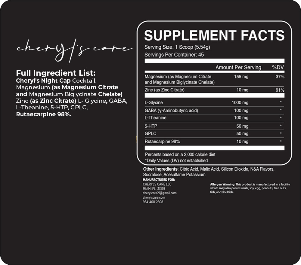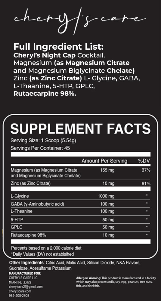 Full Ingredient List: Cheryl’s Night Cap Cocktail. Magnesium (as Magnesium Citrate and Magnesium Biglycinate Chelate) Zinc (as Zinc Citrate) L- Glycine, GABA, L-Theanine, 5-HTP, GPLC, Rutaecarpine 98%.